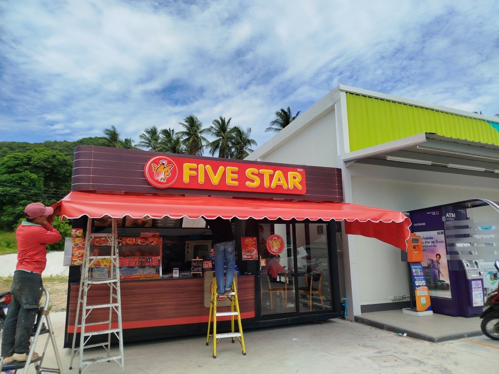เนื่องจากร้านไก่ย่าง 5 ดาว เป็นธุรกิจที่มีผู้คนพลุกพล่าน การสร้างร่มเงาที่เพียงพอและป้องกันสภาพอากาศที่เปลี่ยนแปลงบ่อยบนเกาะสมุย (แดดจัดและฝนตกหนัก) จึงเป็นสิ่งสำคัญ ทีมงานของเราได้ดำเนินการ: