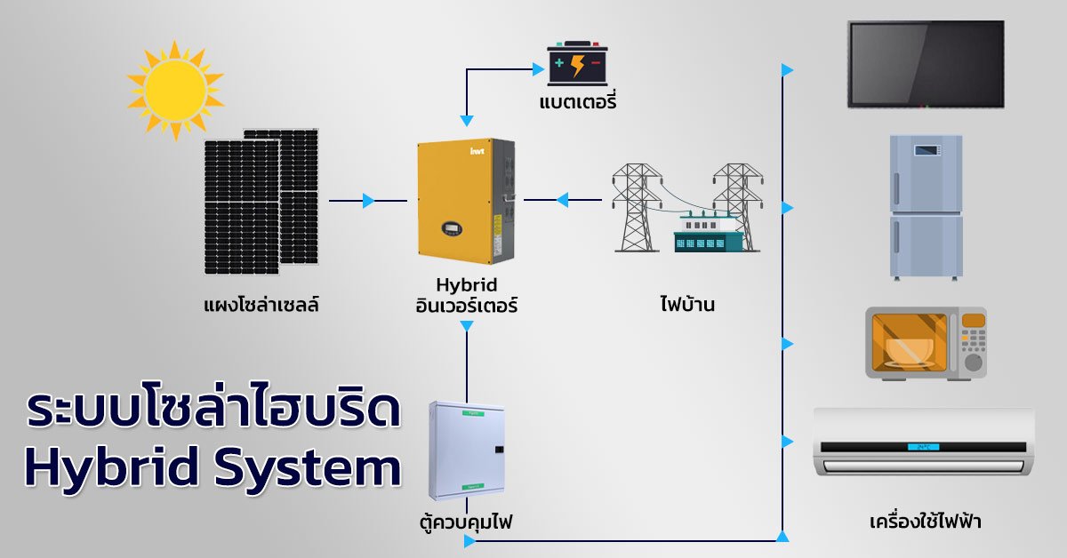 ระบบ Hybrid ผสมผสานระหว่างระบบ On-Grid และ Off-Grid เหมาะกับบ้านพักอาศัย รีสอร์ท หรือธุรกิจที่ต้องการใช้ไฟฟ้าอย่างต่อเนื่อง